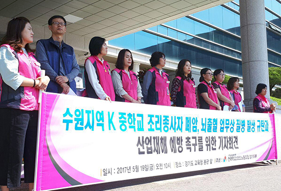 전국학교비정규직노동조합 경기지부는 19일 오전 경기도교육청 본관 앞에서 ‘수원지역 K중학교 조리종사자 폐암, 뇌출혈 업무상 질병 발생 규탄과 산업재해 예방 촉구를 위한 기자회견’을 열었다.