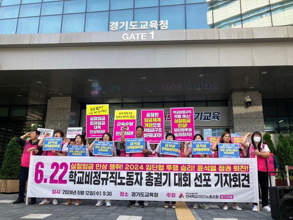 ‘실질임금 인상 쟁취! 2024 임단협 투쟁 승리! 윤석열 정권 퇴진! 6.22 전국학교비정규직노동자 총궐기대회 선포 기자회견’이 12일(수) 오전 경기도교육청 앞에서 열렸다.