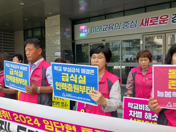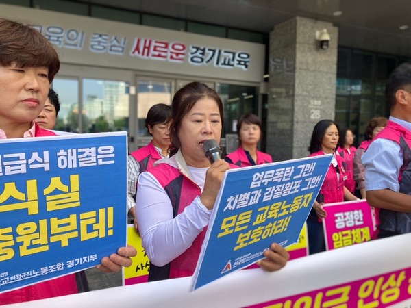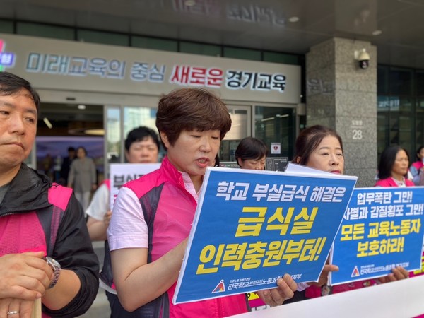 학비 경기지부는 또한 “지난해 서울의 결원으로 인한 부실급식은 몇 년간 학교비정규직노동자들의 경고를 무시해온 교육관료들의 방치가 만들어낸 것이다”라며 “고강도 노동, 저임금이 급식노동자들을 병들게 하고 있다는 외침에도 교육청과 교육부는 ‘환기시설 개선’, ‘급식조리로봇 도입’ 등 사람을 적게 쓸 궁리만 하고 있다”라고 일갈했다.