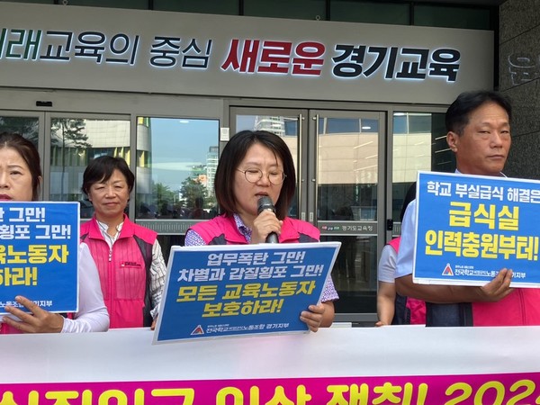 학비 경기지부는 “최근 저출생 문제 해결, 교육복지 강화를 위해 강조하고 있는 늘봄학교 정책은 학교비정규직노동자들 전면 배제한 채 시행되고 있다”라며 “기간제, 임시직으로 점철된 늘봄학교는 파행 운영과 혈세낭비로 만신창이가 되고 있다”라고 성토했다.